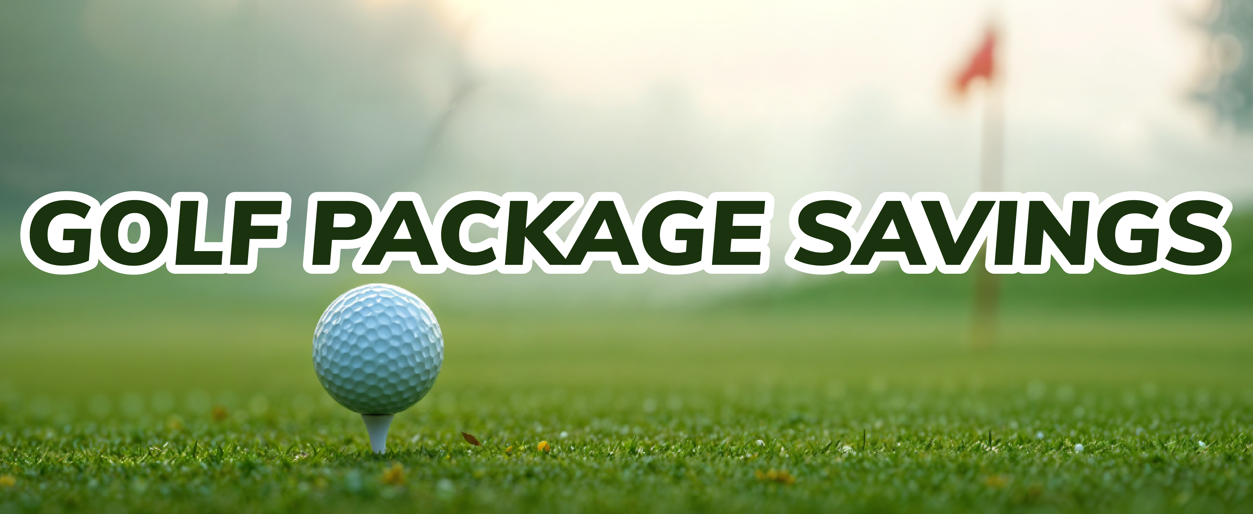 Pricing includes 18 Holes, Golf Cart, Glove and Tees, Bucket of Balls, and Discounted Room Rates